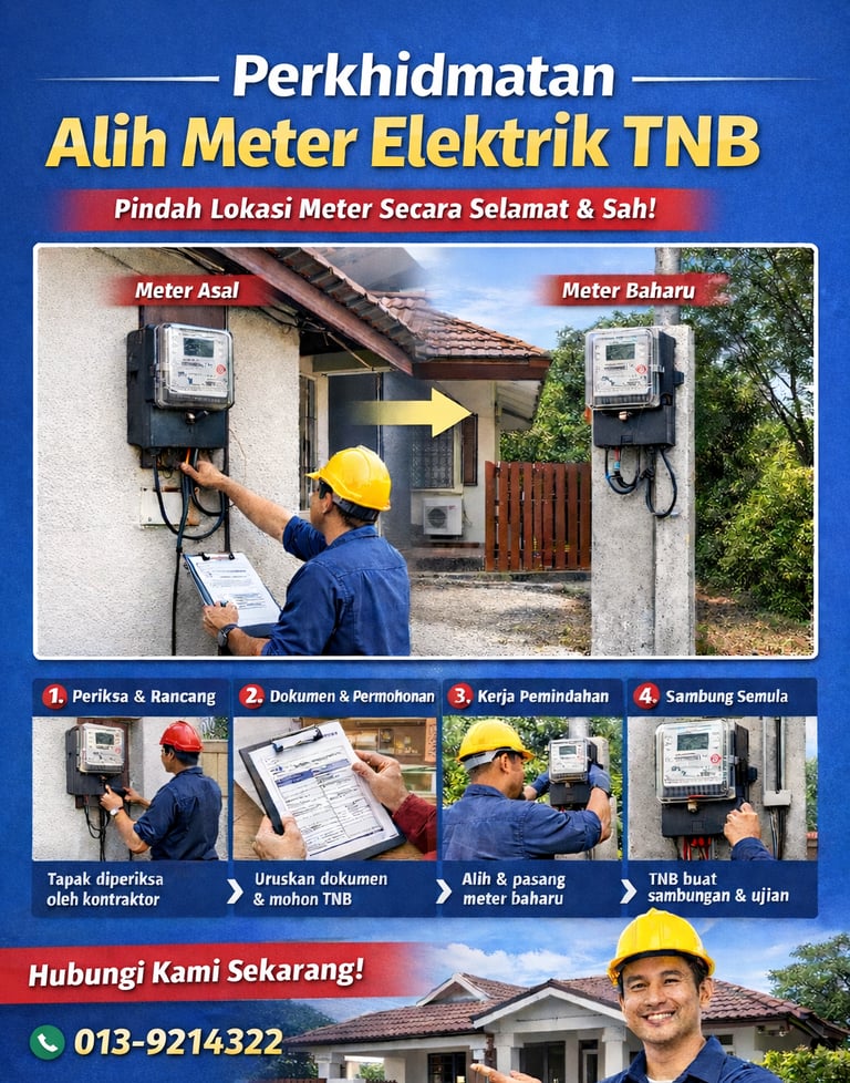 Kami menyediakan servis pemindahan meter elektrik TNB untuk rumah dan premis perniagaan secara selamat, sah dan mengikut spesifikasi TNB. Urusan dikendalikan oleh kontraktor elektrik berdaftar Suruhanjaya Tenaga, termasuk pemeriksaan tapak, penyediaan dokumen, permohonan kepada TNB sehingga kerja siap dan bekalan disambung semula.