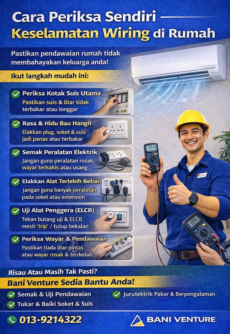 Panduan cara periksa sendiri keselamatan wiring di rumah bagi mengelakkan litar pintas, renjatan elektrik dan risiko kebakaran.